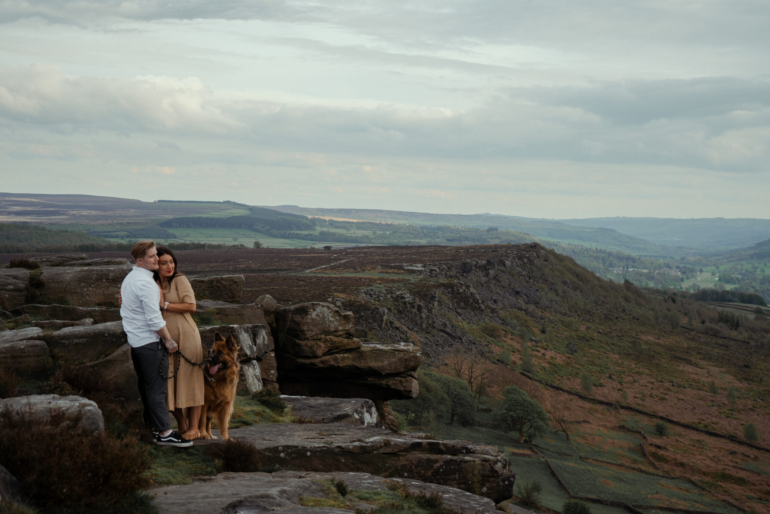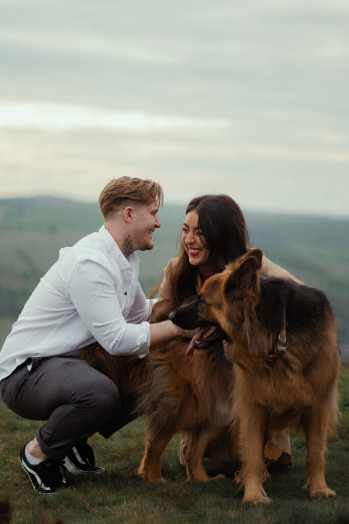 Rosie and Jake’s journey began with a memorable first date at Curbar Edge, a place that now holds even more significance as a backdrop for their engagement photos. They also decided to share this special moment with their beautiful Alsatian, Buddy, who was part of the photoshoot too! During the photoshoot, I used conversational prompts for Rosie and Jake to reflect on their first date together, encouraging them to share their experience and any key moments, feelings and memories that still stand out to them this day.