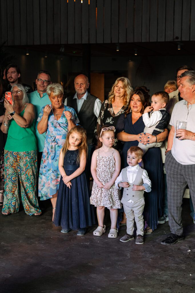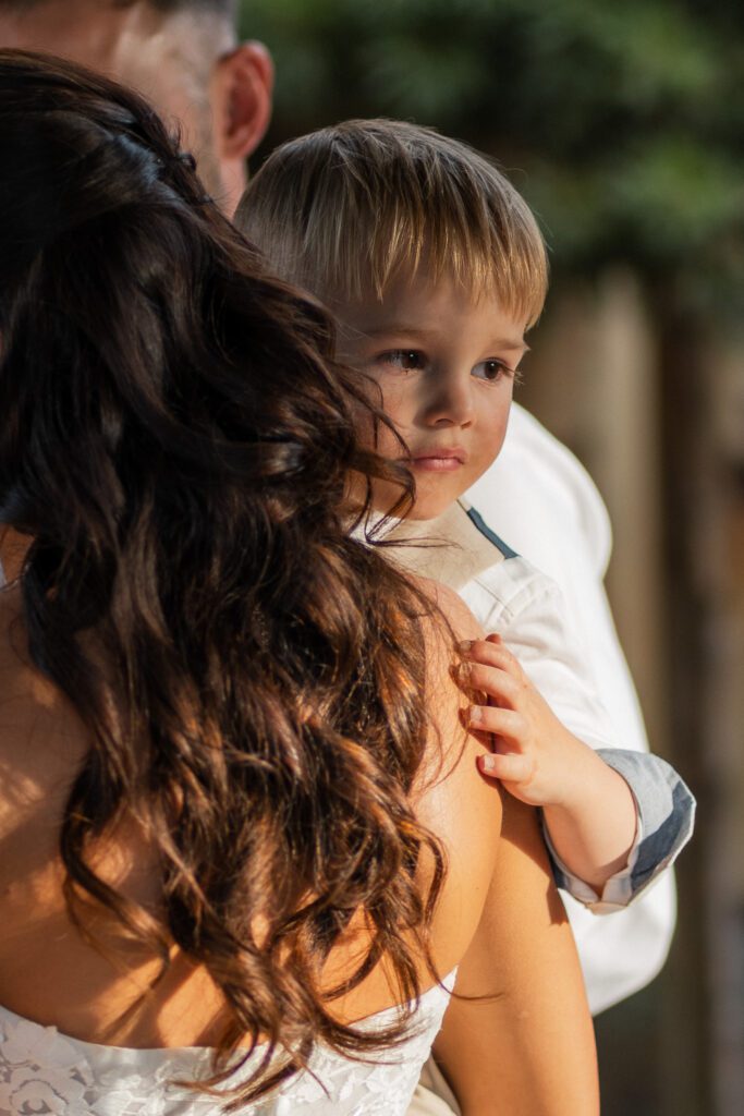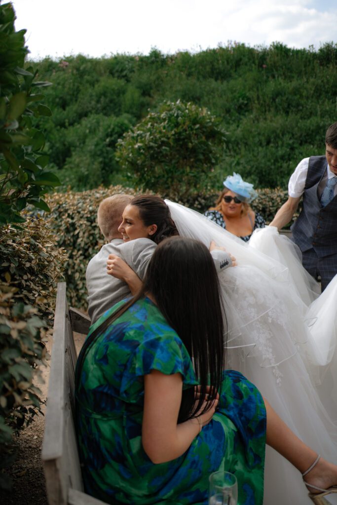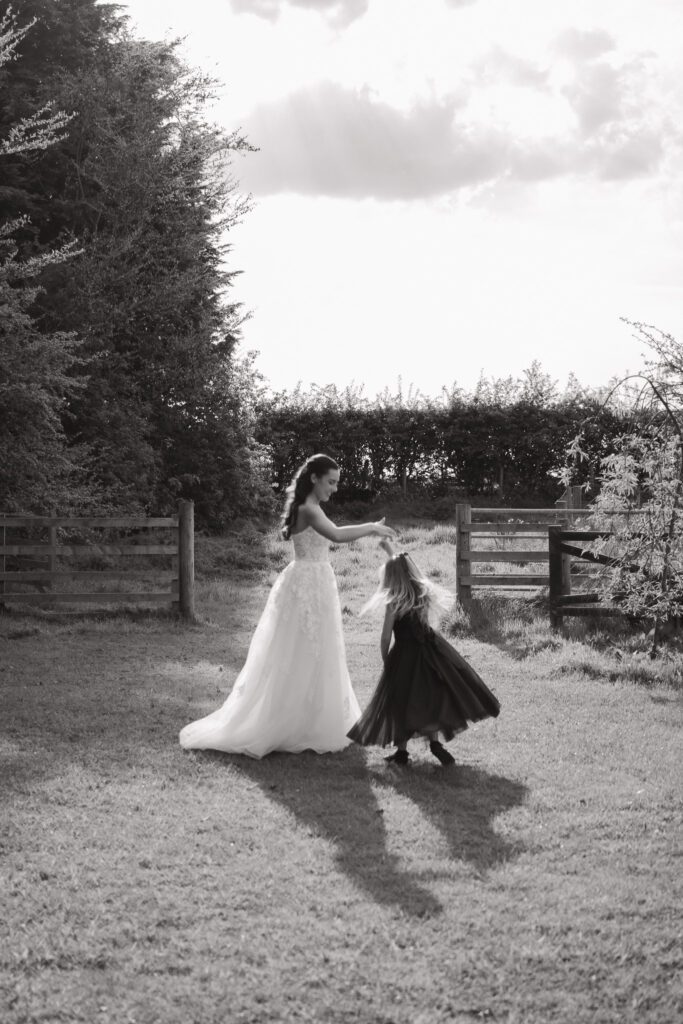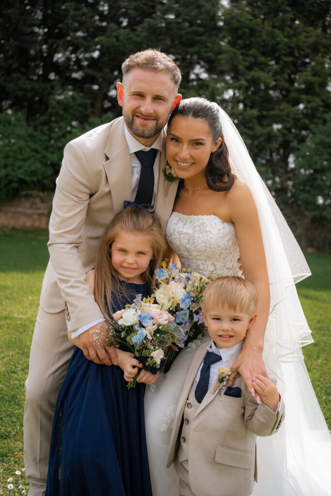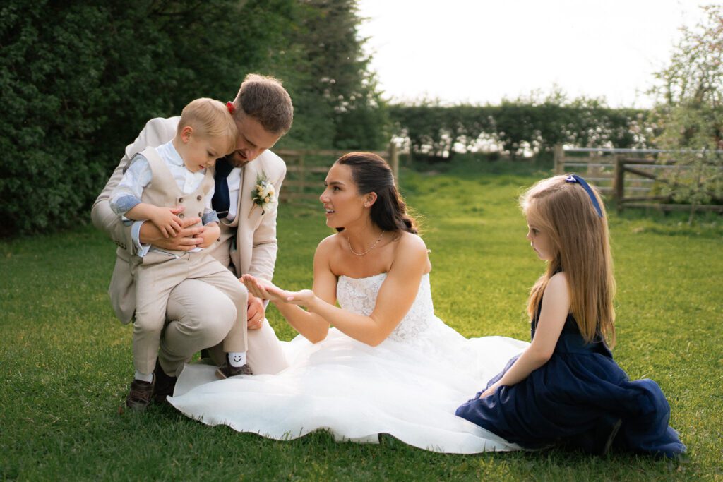 Before heading off to their wedding breakfast and speeches, we spent around 10 minutes capturing their couple portraits and another 10 minutes after dining, for some family moments between Georgia and Michael and their two children. The sun was so bright and hot, and similar to Georgia’s getting-ready moments, it made for some wonderful lighting conditions and contrasts in the photos. Although I’d recommend having photos with any children/guests before food (to avoid marks on clothes!), it can sometimes work out better to have them after food if the gap between getting ready moments and dinner is closer together. Kids usually have a final burst of energy after eating, so you can lean into their playful and excitable energy easier.