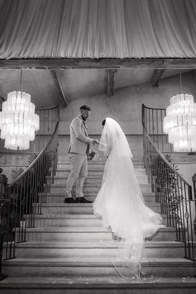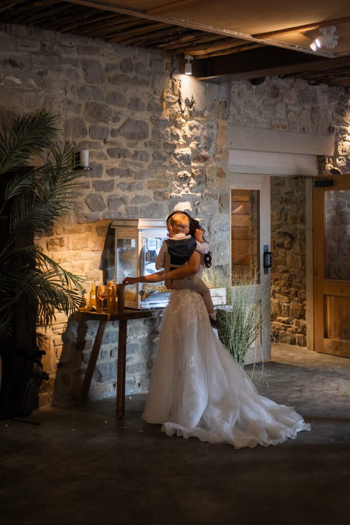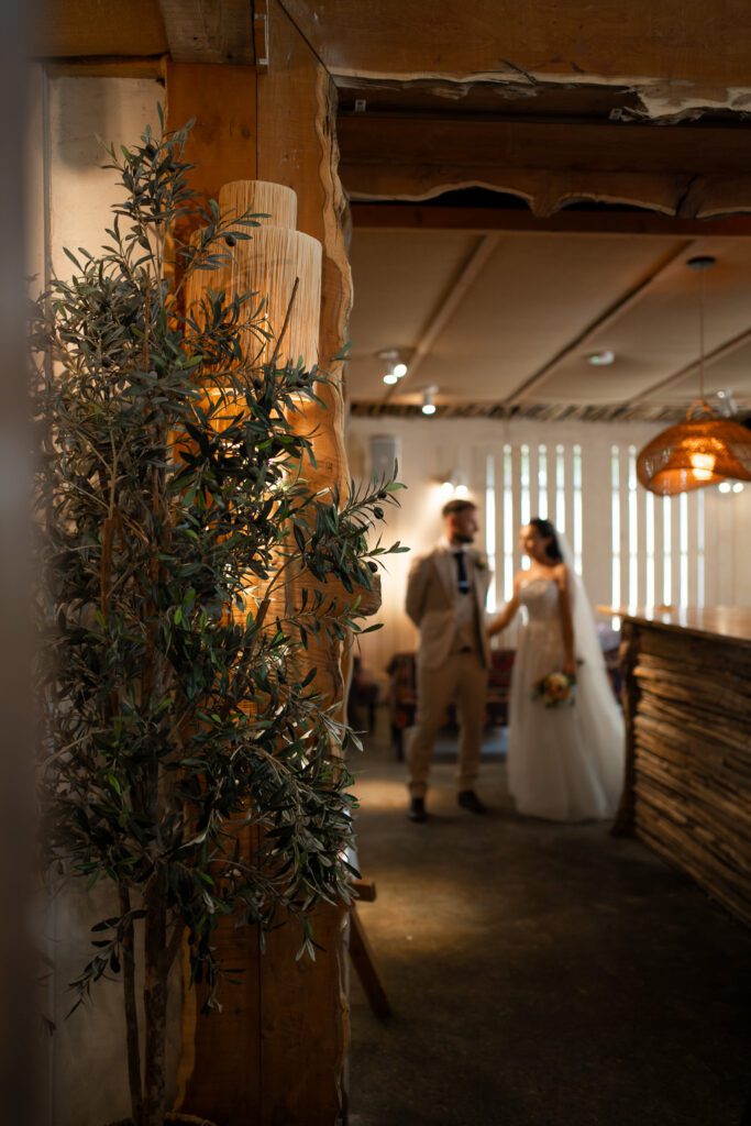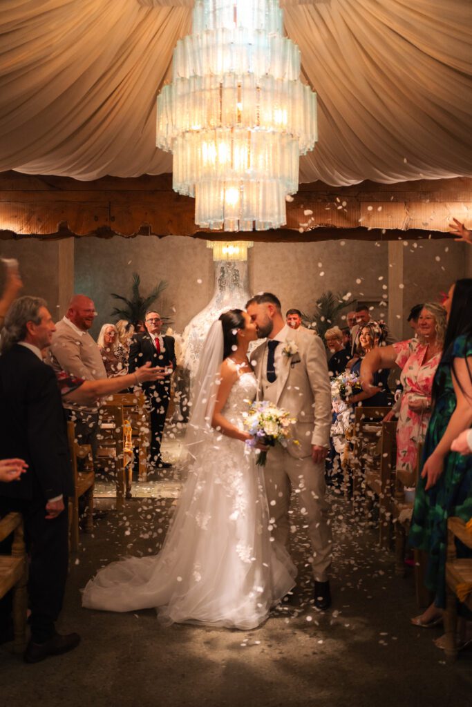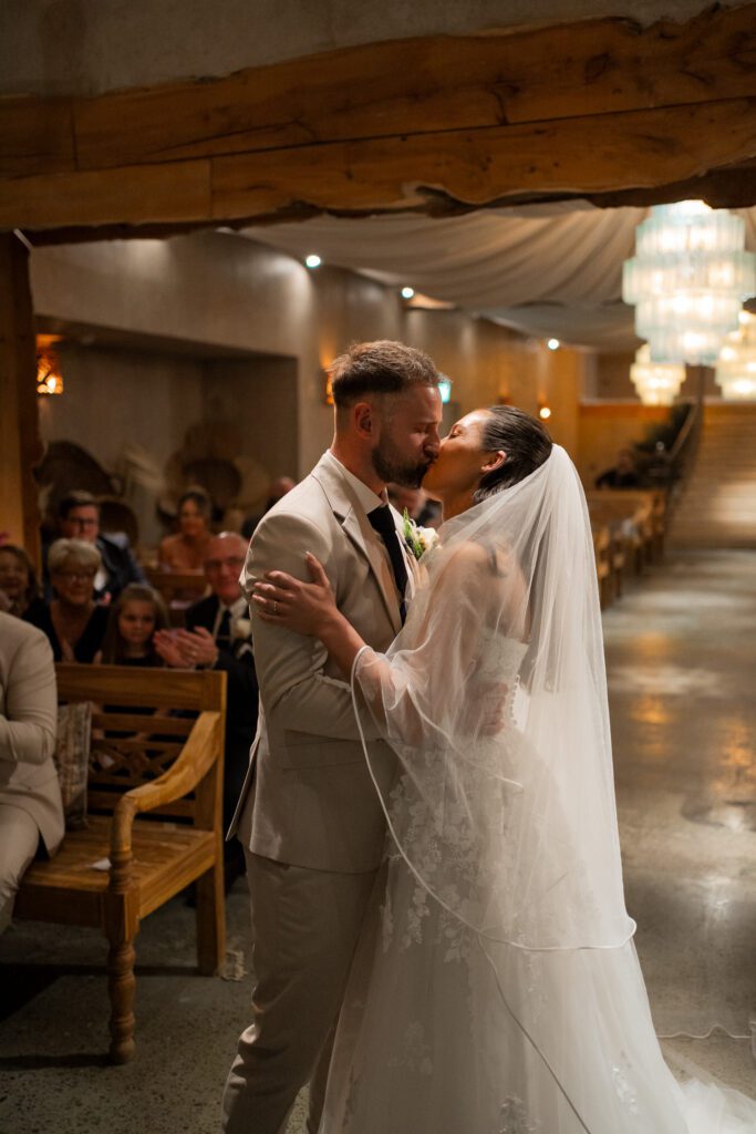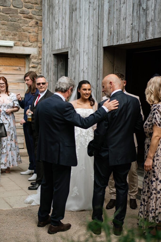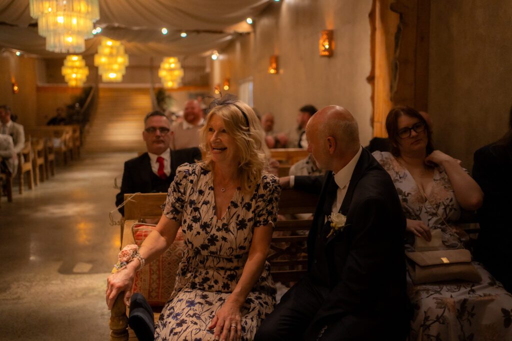 The ceremony space at Runa Farm was full of warmth and ambience. Although there is no natural light, it made the ceremony feel close-knit and homely. Georgia and Michael had their confetti moments captured during their exit, which was such a lovely change from capturing it outdoors. It also worked out perfectly because they did a mid-isle pause for another first kiss (stood directly under the main chandelier!), and guests sat further in the isle waited to throw their confetti. Perfect, divine timing! After the confetti, Georgia and Michael stepped upstairs to have a few quiet moments together before later joining their guests for the drinks reception. I waited until they were just out the door and quietly captured one of my favourite moments, Georgia looking back at all of their guests. That familiar glance you take when saying goodbye, as if to linger in the moment a little longer with the people who matter most.