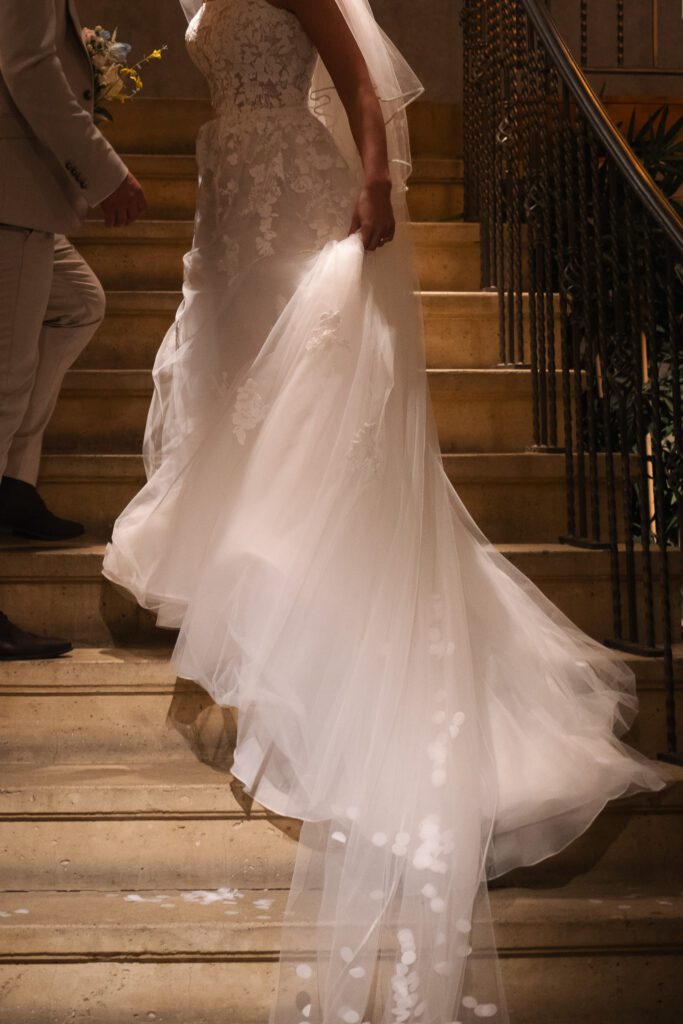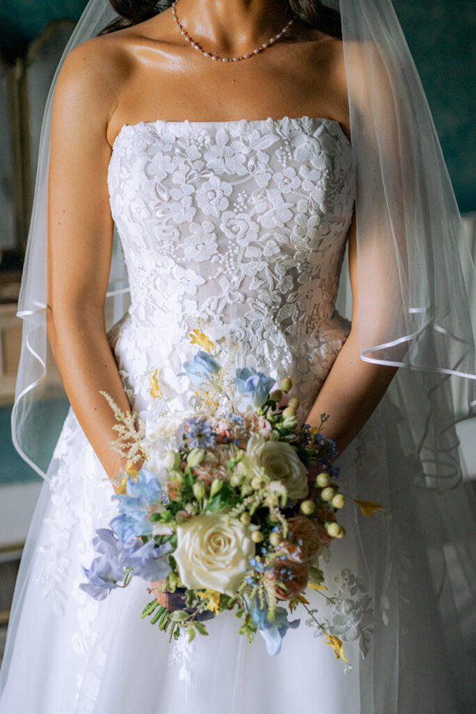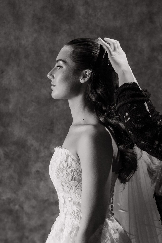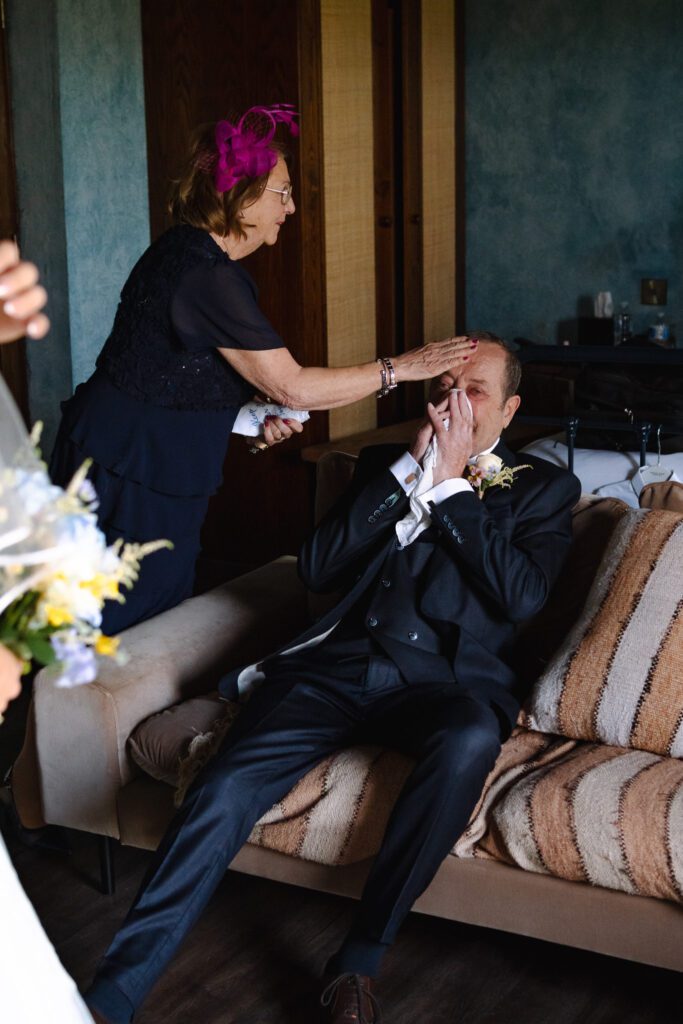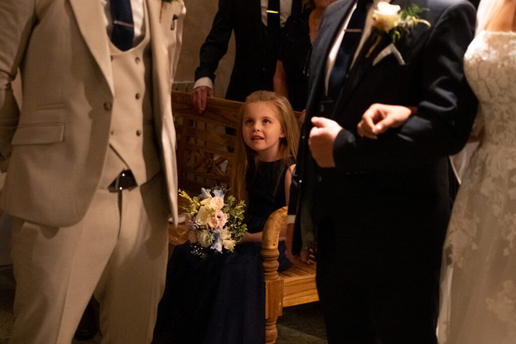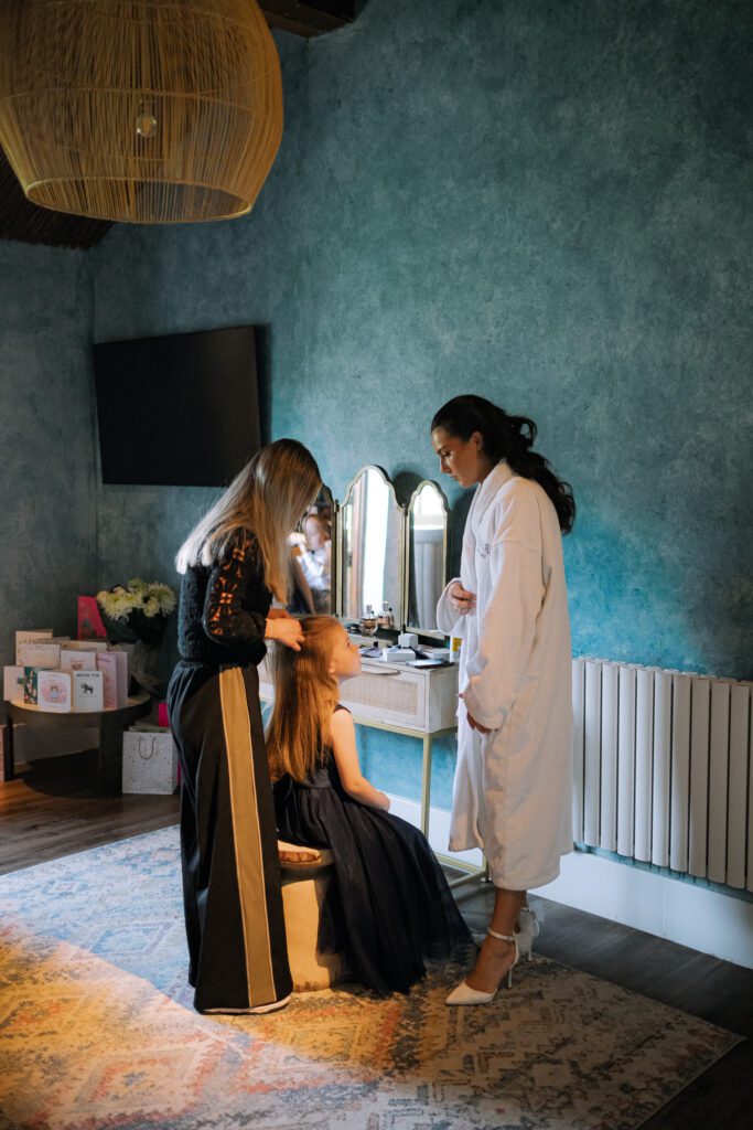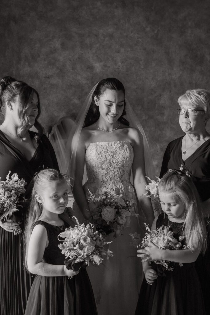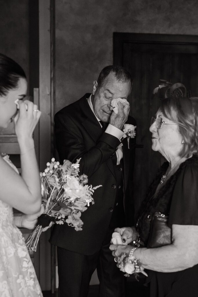 That feeling was present from the moment I arrived. I joined Georgia and her bridal party as they were finishing getting ready, to capture a few in-between moments before she shared an emotional first look with her dad and grandparents. The bridal room was dimly lit with an orange ambient glow, contrasting the bright direct light from the French doors. In turn, this contrast created a more dramatic, emotive feel, particularly during the portraits and family reactions.