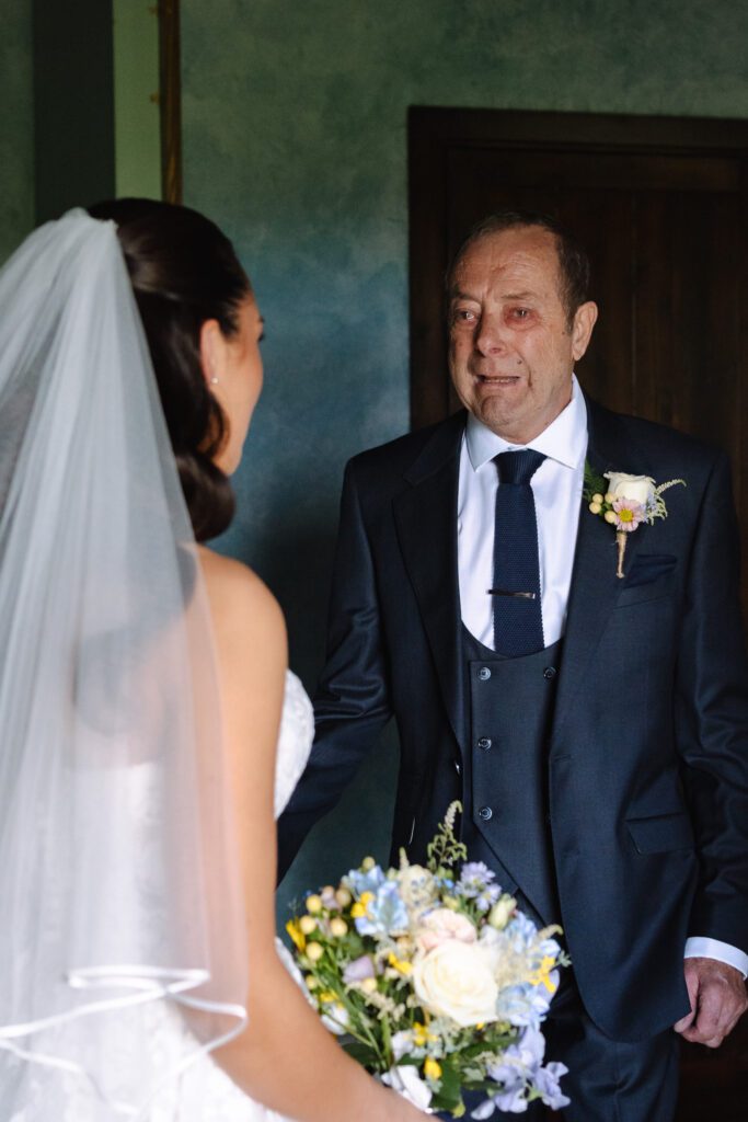 Georgia shared an emotional first look with her dad, followed by her grandparents, and it was one of the most memorable moments from their day. Their reactions were so sweet to witness – you could really feel the pride, joy and love they all share for one another. There is something so special about photographing first look moments, because they are never rushed. It’s as if time just stands still for a moment, and emotions flood to the surface. A rush of excitement, admiration, nerves, and love. There was a lovely moment i’ve included below, where Georgia’s grandad was sat on the sofa opposite Georgia and I went behind him to capture a photo of her from his point of view. I think it’s these varied perspectives that add the most dimension to galleries – it paints a wider view of the moments and deepens the emotions. Because you’re not just seeing them literally happen directly from the ‘photographers’ point of view, but each other’s vantage points too.