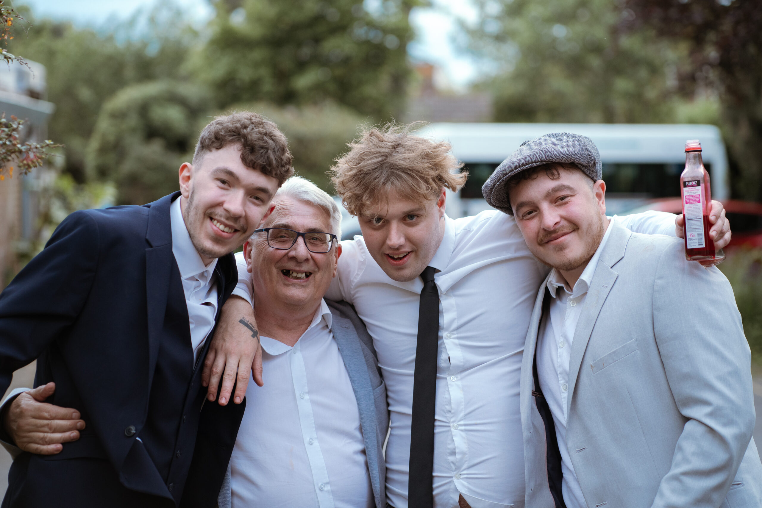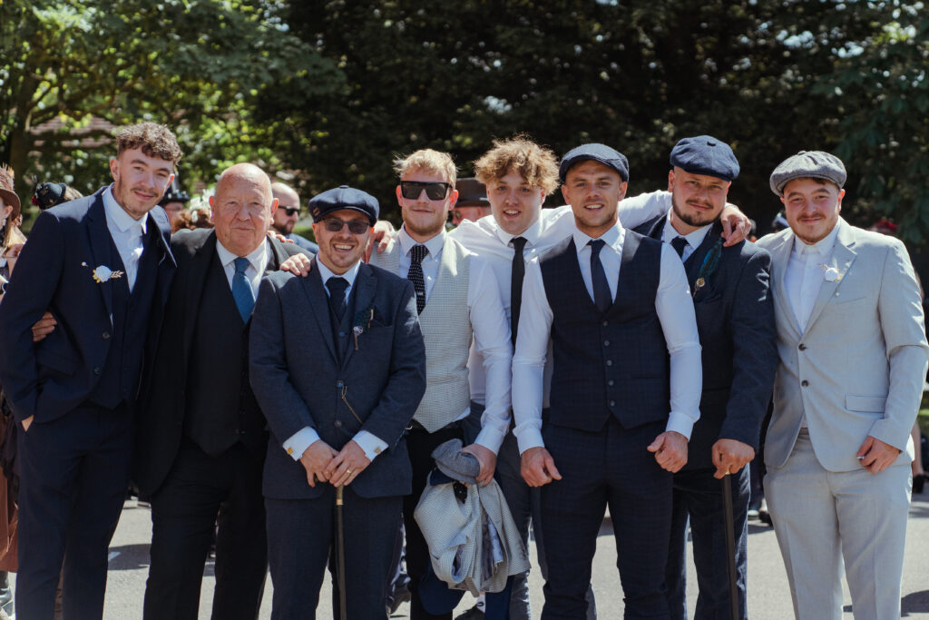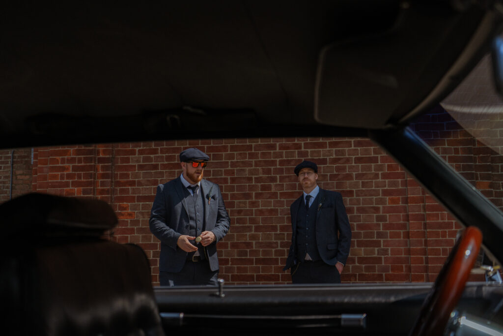 In true Peaky Blinders style, Clifford and his groomsmen arrived looking fresh and dapper… riding in a 1960s Gold Cadillac. Shades on, window down, cigar in the suit pocket – and a massive grin. Love it! We used this time to photograph Clifford and his Groomsmen before guests began arriving and the priest ushered everyone into the church, awaiting the arrival of Charlotte and her bridal party.
