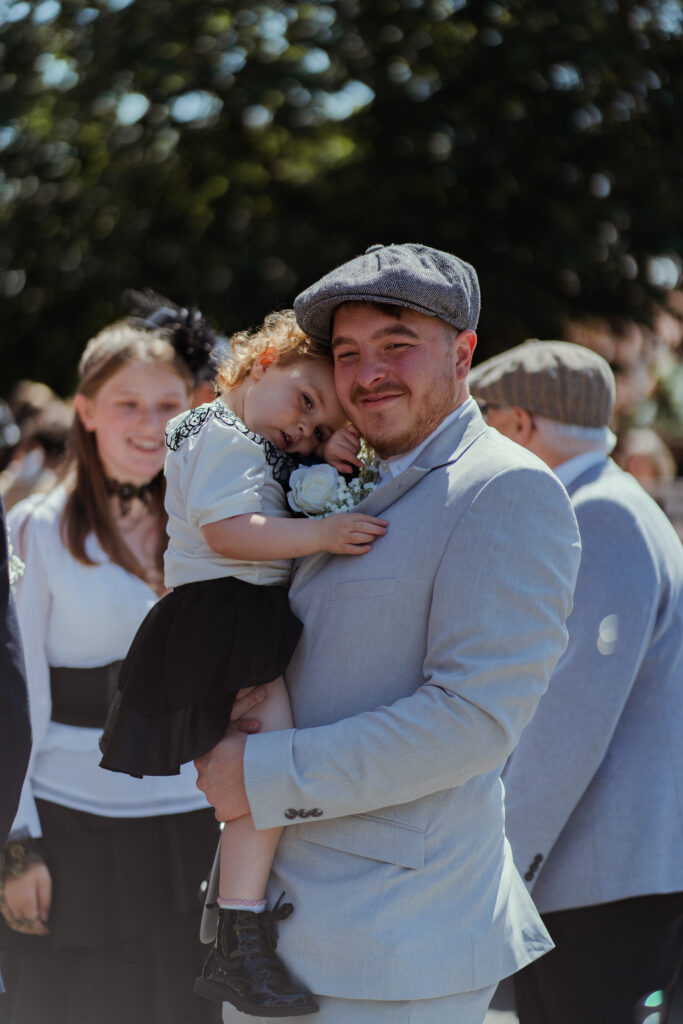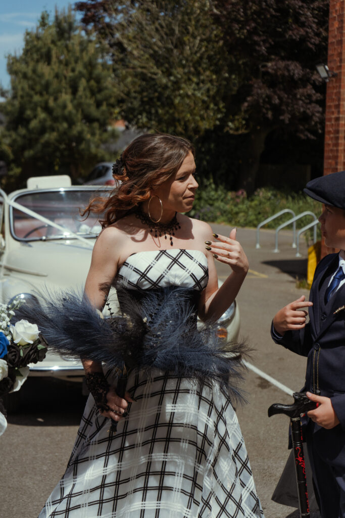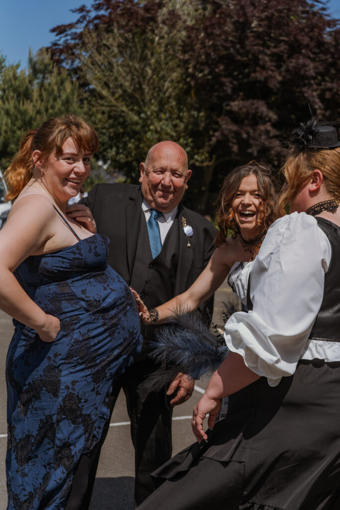 On the morning of their spring wedding, I met Charlotte and her bridal party at her and Clifford’s home in Lee-on-the-Solent. Before I even made it through the door, I was greeted by their three CUTE dogs who were individually dressed in their steampunk outfits. I knew from that moment that this wedding was going to be such a vibe because even the dogs were dressed the part! Charlotte was in the garden finishing off having her make-up done, so we spent some time here catching up, getting some photos with the dogs, and candid shots before she and the girls got into their outfits. Once everyone was ready, we took some more photos around the house and in the garden before I made my way to photograph Clifford and his groomsmen arriving at the church.