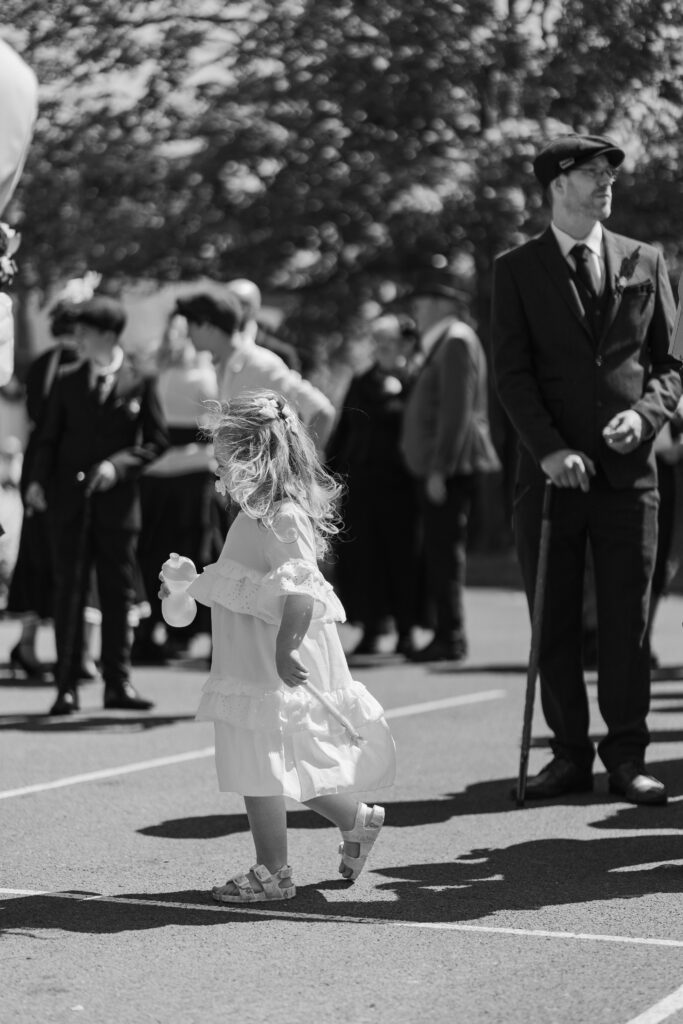 Charlotte and her dad arrived in a cream Morris Minor and spent a little time chatting with friends and family before making their way into the ceremony. Emotions were high, the sun was gleaming down and there wasn’t a cloud in sight. A hot day to be wearing black but it looked so good against the bright blue skies. It was amazing seeing everyone dressed up. Sometimes wedding themes can fall short if only a handful of people take part in the theme, but the commitment from their guests was unrivalled!